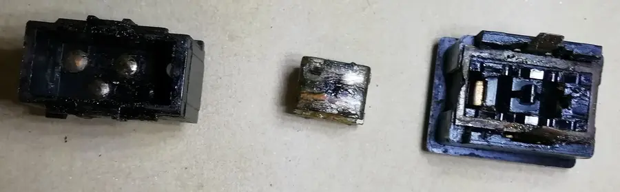 The removed fan switch internal parts showing how over years dirt and corrosion builds up to degrade power flow.