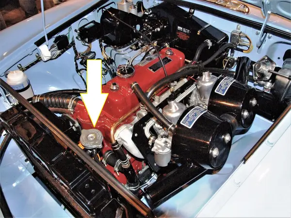 1977 model year and later cars moved to a sealed cooling system. The green arrow shows the expansion tank. The Blue arrow for the new cooling system fill point and the red arrow for the bigger bore and more secure connection between rad and expansion tank. Note early radiator overflow pipes are unsuitable to be converted to expansion tank connections.